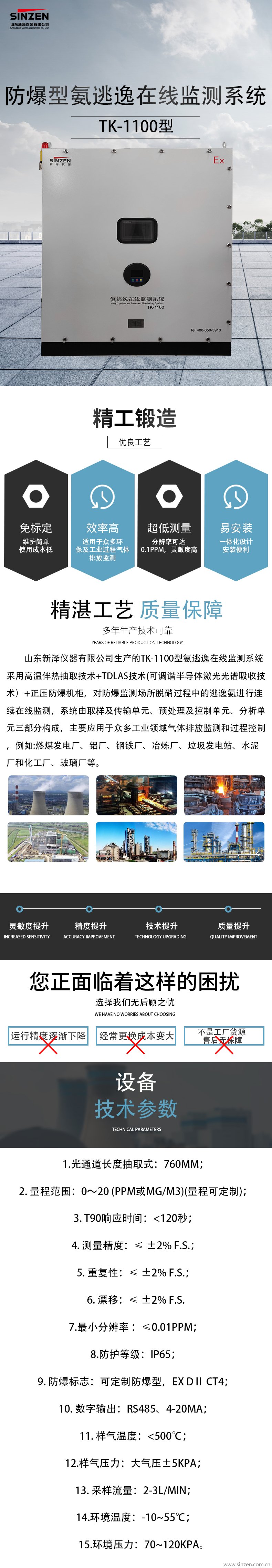 对于常规火电厂运行,氨逃逸浓度监测如果高于3ppm,从CEMS安全运行的角度而言就要采取措施,调整喷氨量。山东新泽仪器有限公司生产的TK-1100型氨逃逸在线监测系统采用高温伴热抽取技术,对脱硝过程中的逃逸氨进行连续在线监测,系统由取样及传输单元、预处理及控制单元、分析单元三部分构成,主要应用于众多工业领域气体排放监测和过程控制,例如:燃煤发电厂、铝厂、钢铁厂、冶炼厂、垃圾发电站、水泥厂和化工厂、玻璃厂等。